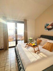 La zona notte offre una camera matrimoniale con balcone arredato vista lago e una seconda camera con due letti singoli. Il bagno è completo di doccia e vasca. La cucina è ampia e completamente attrezzata; il soggiorno, con TV da 55”, divano confortevole e tavolo da pranzo, si apre su un secondo balcone abitabile, perfetto per colazioni e cene all’aperto con vista. L’esperienza è pensata per massimizzare comfort, funzionalità e qualità percepita.